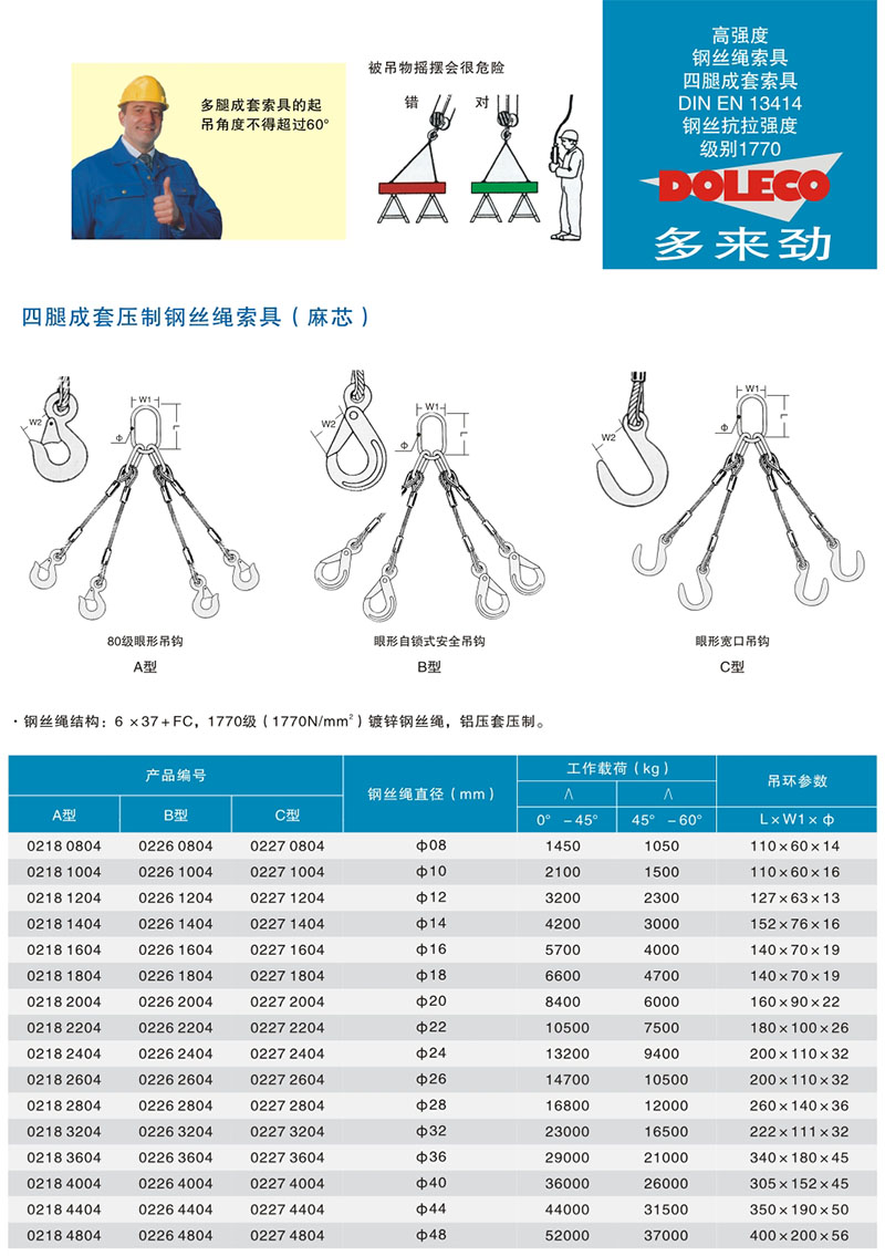 DOLECO四腿成套壓制鋼絲繩索具(麻芯)